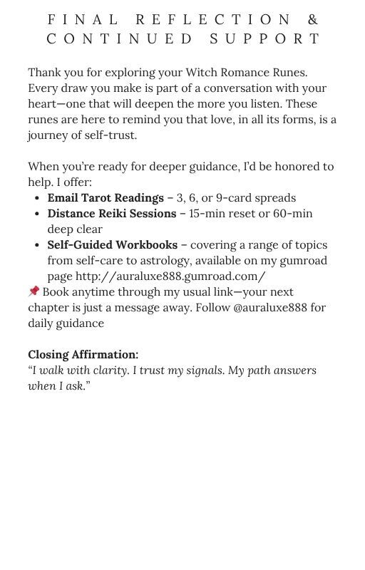 The Witch Runes Guidebook: Love Edition is your complete companion for using the Witch Runes in romance and relationship readings — whether you’re dating, deepening a bond, or deciding your next step. Every page is designed to turn insight into action, so you can move forward with clarity and confidence.