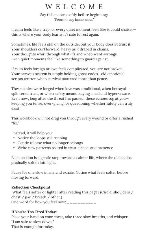 This 13-page guide helps you identify and release the “ghost codes” — old emotional patterns and nervous system reflexes that keep you tense, over-giving, or bracing for harm, even when life is calm.